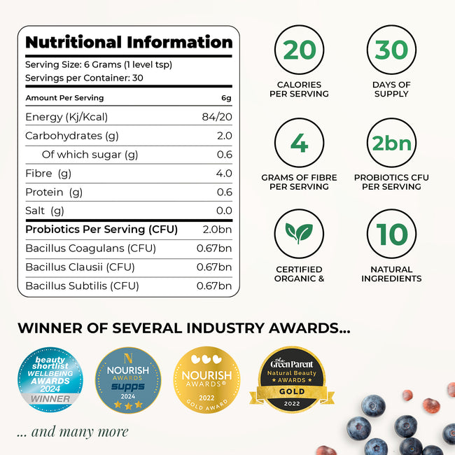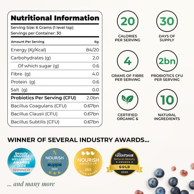 Our blend of beautiful berries includes organic blueberry, acai berry, aronia berry and goji berry, and is packed with prebiotic fibre and antioxidants, making it a great (and colourful) gut health enhancer.